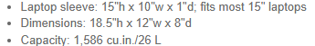 Designed with maximum space utilization and smart organization, this pack lets you carry office or travel must-haves in true OGIO style. 600D poly two-tone/420D dobby poly Rear-entry, suspended, padded laptop compartment Padded tablet/e-reader sleeve Side office pockets with pen holders, large zippered pocket, mesh pocket, slip pocket Easy-access pocket on top of bag for valuables or change Ergonomic shoulder straps with adjustable sternum strap Luggage trolley strap with hook and loop closure Laptop sleeve: 15"h x 10"w x 1"d; fits most 15" laptops Dimensions: 18.5"h x 12"w x 8"d Capacity: 1,586 cu.in./26 L Weight: 2.1 lbs./0.99 kg